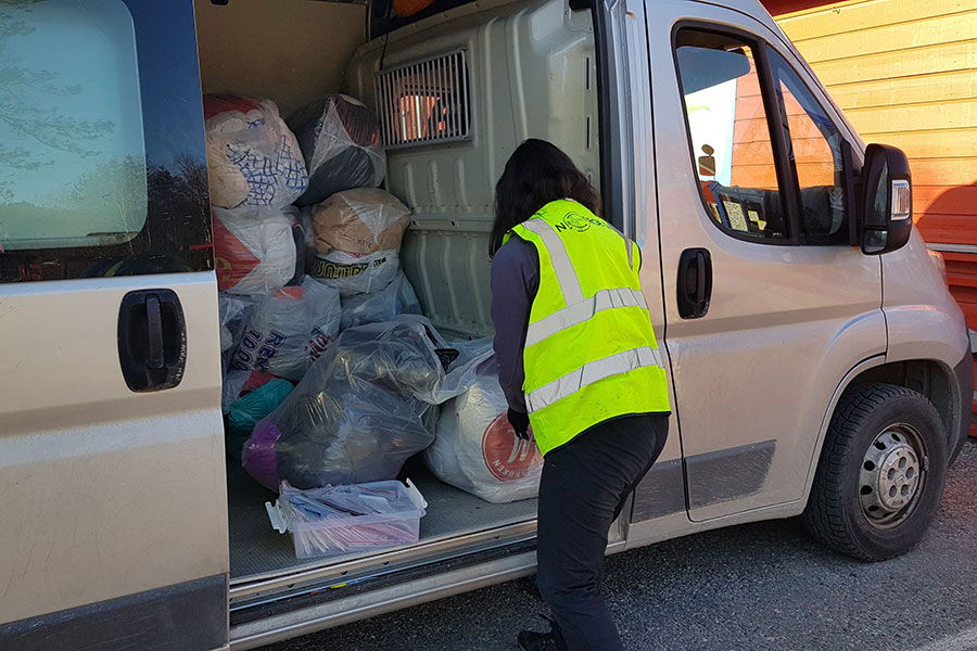Klærne pakkes usortert inn i lagercontainere / trailere. Kun avfall fjernes før pakking.